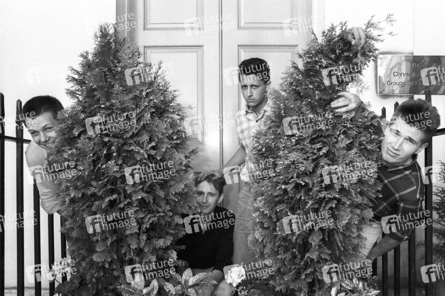 Iain Harvie, Bryan Tolland, Paul Tyagi und Justin Currie von Del Amitri bei einem Photoshooting vor dem Chrysalis Records Office. London, 12.07.1985