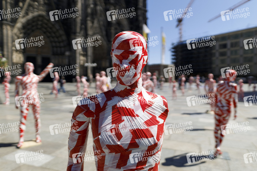 Kunst-Installation 'It is like it is - Mahnmal zur Coronakrise - 2020', einer Installation aus 111 maskierten Schaufensterpuppen, von Dennis Josef Meseg anlässlich der strengen Maßnahmen der Bundesregierung wegen der Coronakrise auf der Domplatte. Köln, 05.05.2020