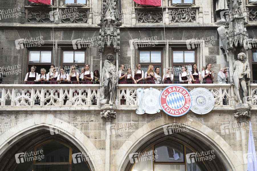 Die Frauenmannschaft bei der Meisterfeier des FC Bayern München auf dem Balkon des Rathauses am Marienplatz. München, 18.05.2025
