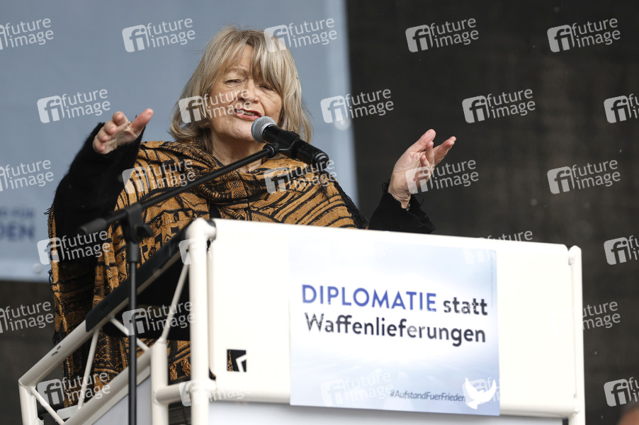 Alice Schwarzer.spricht auf der umstrittenen Friedensdemo und Kundgebung für Verhandlungen mit Russland statt Waffenlieferungen für die Ukraine am Brandenburger Tor. Dazu aufgerufen haben die Linken-Politikerin Sahra Wagenknecht und die Frauenrechtlerin Alice Schwarzer. Berlin, 25.02.2023