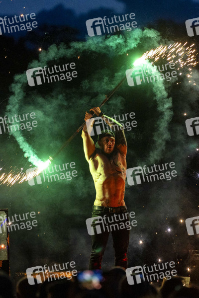 Die Feuershow 360GradEvent bei den Pyro Games 2024 - Feuer, Licht, Laser. Das Duell der Feuerwerker auf dem Messegelände. Erfurt, 17.06.2024