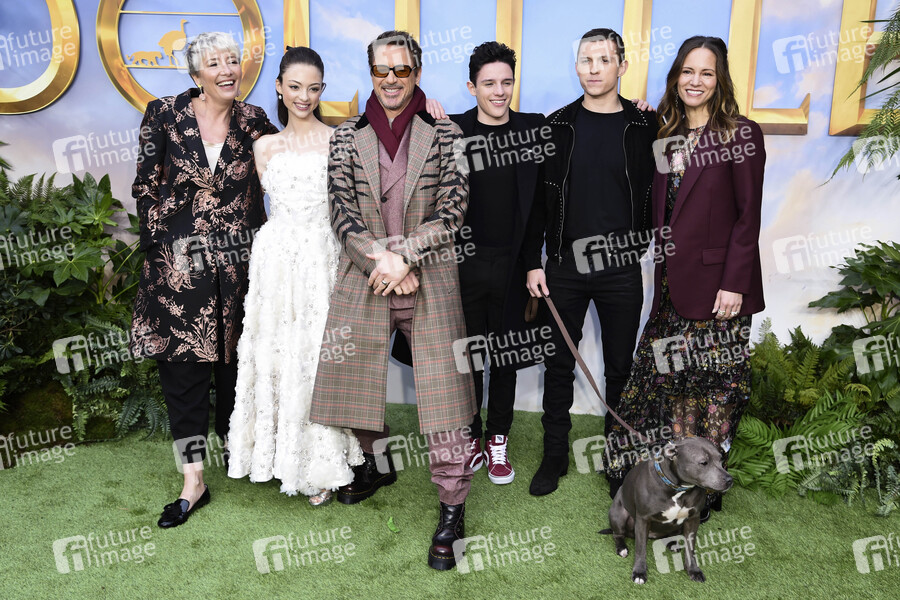 Emma Thompson , Carmel Laniado, Robert Downey Jr., Tom Holand, Harry Collett und Susan Downey bei der Premiere des Kinofilms 'Dolittle / Die fantastische Reise des Dr. Dolittle' im Empire Leicester Square. London, 25.01.2020