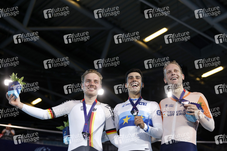 Moritz Malcharek, Iuri Leitao und Roy Eefting bei der Siegerehrung Scratch 15km Männer bei den European Championships 2022 im Bahnradsport in der Messe München. München, 13.08.2022