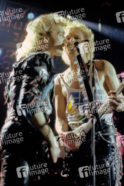 Francis Buchholz und Rudolf Schenker von den Scorpions live bei einem Konzert der 'Savage Amusement World Tour 88-90' im Hammersmith Odeon. London, 20.02.1989