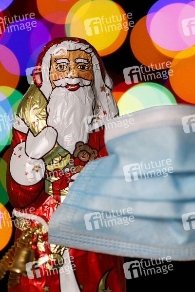 Schoko-Weihnachtsmänn von Lindt halten eine Gesichtsmaske. Im Hintergrund eine Lichterkette. (Themenbild, Symbolbild) Köln, 19.11.2020