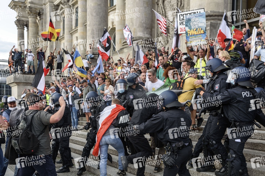 Coronaleugner, Verschwörungstheoretiker und rechte Gruppen der Initiative Querdenken protestieren mit einer Großdemonstration gegen die bestehenden Maßnahmen zur Eindämmung der Corona-Pandemie. Vornehmlich Reichsbürger versuchten im Anschluss an die Abschlusskungebung des Reichstagsgebäude zu stürmen. Es kam zu Auseinandersetzungen mit den eingesetzten Sicherheitskräften. Wegen Nichteinhaltung der polizeilichen Auflagen wurde die Demonstration durch die Polizei beendet. Berlin, 29.08.2020