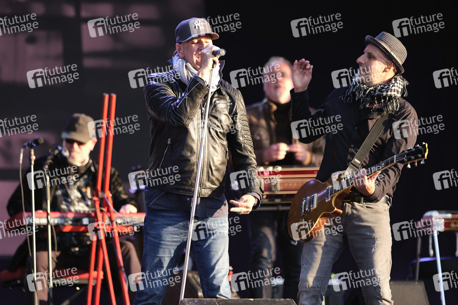 Kai Wingenfelder und Thorsten Wingenfelder von Fury in the Slaughterhouse live beim Autokultur-Konzert auf dem Schützenplatz. Die Besucher verfolgen unter Berücksichtigung klarer Hygiene-Vorschriften während der Corona-Krise den Auftritt aus dem Auto. Hannover, 14.05.2020