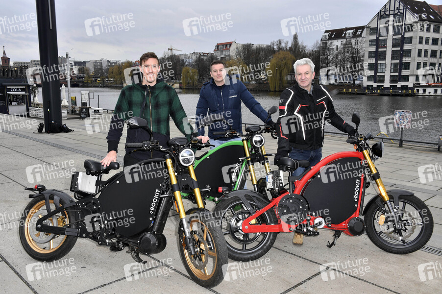 Max Kruse, Aaron Troschke und Andy Zurwehme beim Fototermin zur Eröffnung der Zweiradsaison 2021 mit eROCKIT an der East Side Gallery. Berlin, 11.03.2021
