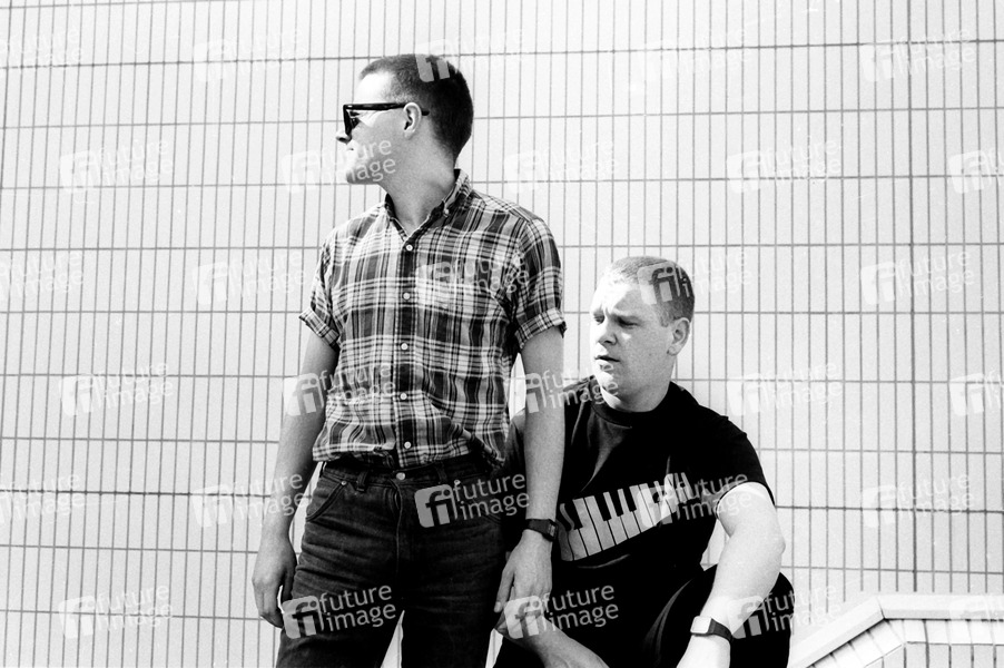 Larry Steinbachek und Steve Bronski von Bronski Beat bei einem Photoshooting auf dem Dach des PolyGram Records Gebäudes. London, 26.06.1984