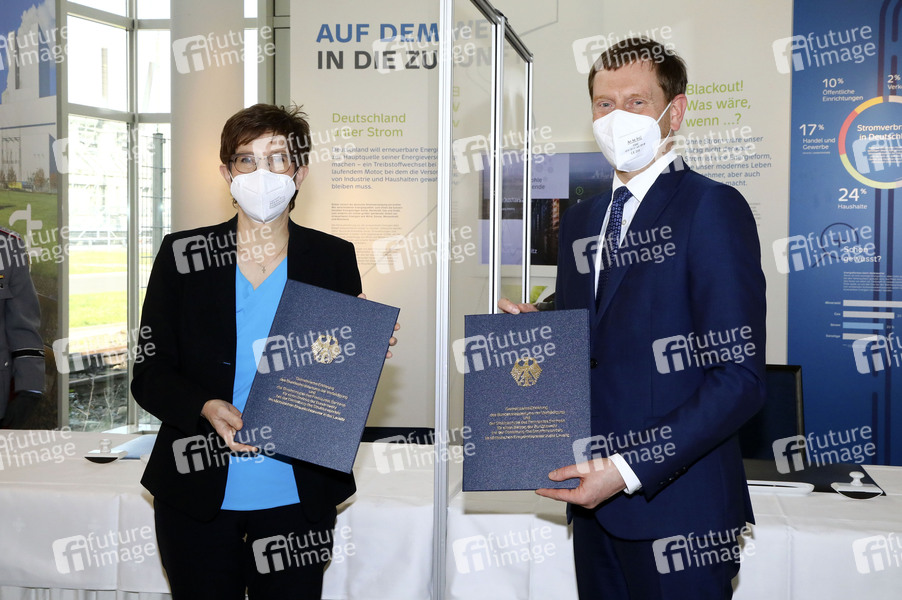 Bundesverteidigungsministerin Annegret Kramp-Karrenbauer und Ministerpräsident Michael Kretschmer bei der Unterzeichnung einer gemeinsamen Erklärung für einen Beitrag der Bundeswehr bei der Bewältigung des Strukturwandels im sächsischen Braunkohlerevier in der Lausitz im Kraftwerk Boxberg. Boxberg, 31.03.2021