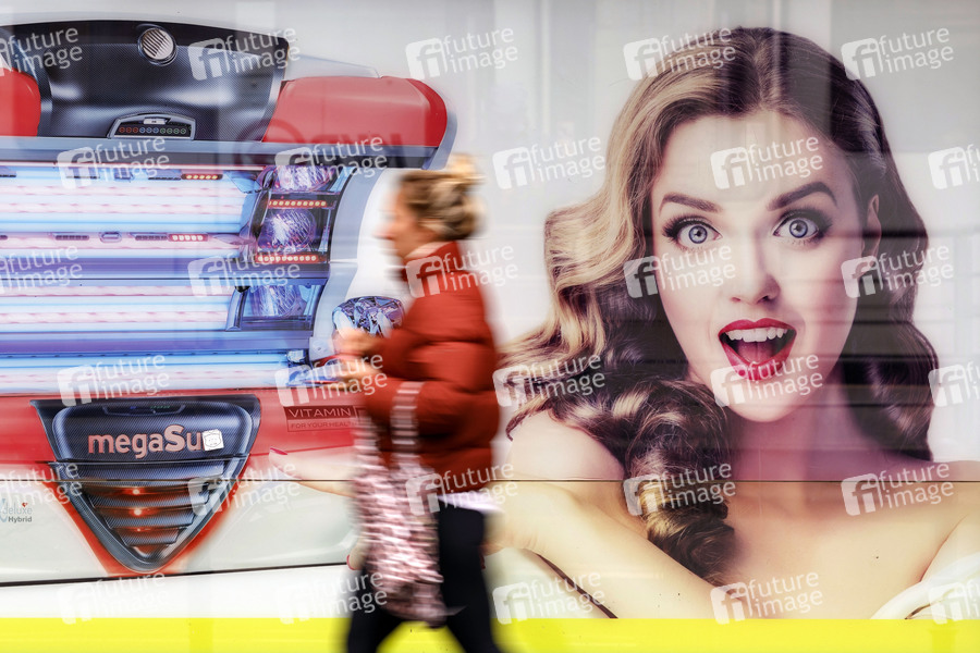 Eine von der Sonne ausgebleichte Werbung für eine neue Sonnenbank an einem Sonnenstudio. Sonnenstudios sind von den Corona-Regeln betroffen und müssen bei Inzidenz über 100 wieder schließen. (Themenbild, Symbolbild) Köln, 29.04.2021