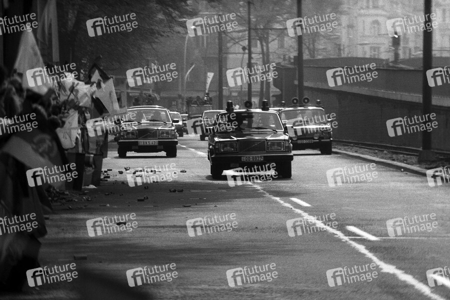 Politik, DDR, Personen, Wende, friedliche, Revolution, Berlin, Ost, Ostberlin, Ost-Berlin, Wendezeit, Zeitgeschichte, Ankunft, Kolonne, Fahrzeug, Fahrzeuge, Limousine, Limousinen, Schüler, Fahne, Fahnen, Flagge, Flaggen, Begrüßung, Begrüßungen, Politik