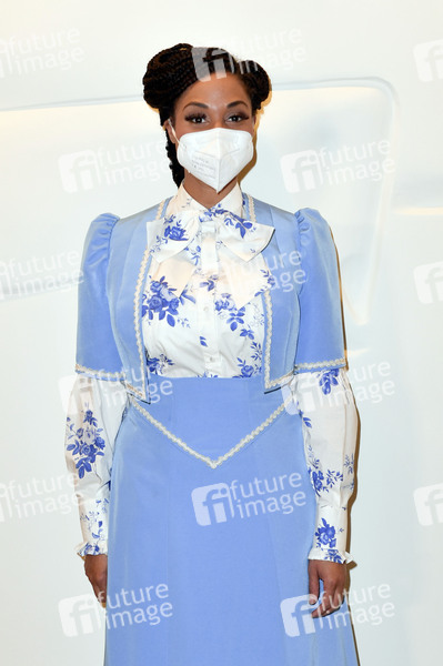 Vanessa Rottenburg beim Fototermin mit dem (getesteten) Ensemble des Theaterstücks 'Vorhang auf für Cyrano' in Maske und Kostüm vor dem Testzentrum im Schiller Theater. Unter dem Motto 'Testen statt spielen' eröffnen die Komödie am Kurfürstendamm und der KitKatclub ein gemeinsames Testzentrum im Schiller Theater. Berlin, 07.04.2021