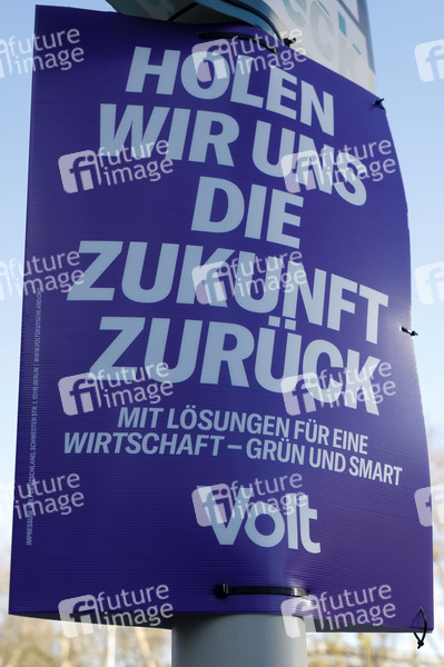 Beeinflussung der Wählerin, Botschaft, Bundestagswahl, Bundestagswahlen, Bundestagswahlkampf, Eigenwerbung, Kampagne, Kandidat, Kandidaten, Kandidierende, Kleinflächenplakat, Logo, Partei, Partei-Symbol, Parteien, Parteienwerbung, Parteilogo, Plakat, Plakatkampagne, Plakatständer, Politik, Politiker, Politikerinnen, Protestwähler, Slogan, Stammwähler, Wahl, Wahlbeeinflussung, Wahlbeteiligung, Wählen, Wählerschicht, Wählerschichten, Wahlkampagne, Wahlkampf, Wahlkampfmodus, Wahlkandidat, Wahlprogramm, Wahltermin, Wahlwerbung, Wirkung, Wirkungsmacht, Volt Deutschland, Symbolbild, Symbolfoto, Themenbild, Thememfoto