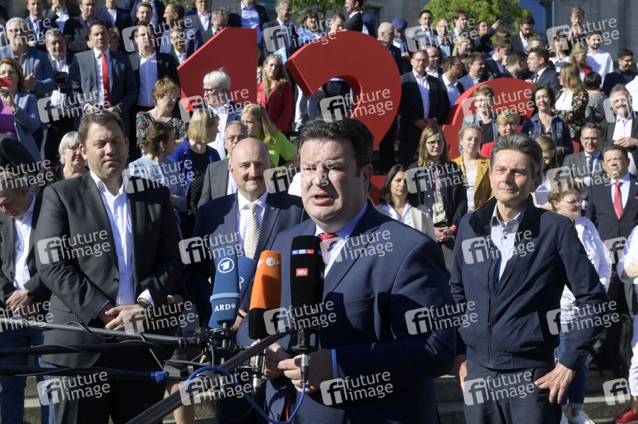 Lars Klingbeil, Hubertus Heil und Rolf Mützenich mit Gewerkschaftern und SPD-Mitgliedern bei einer Kundgebung zur Befürwortung des 12-Euro-Mindestlohns vor dem Reichstagsgebäude. Heute wird im Bundestag über den 12-Euro-Mindestlohn ab Oktober 2022 abgestimmt. Berlin, 03.06.2022