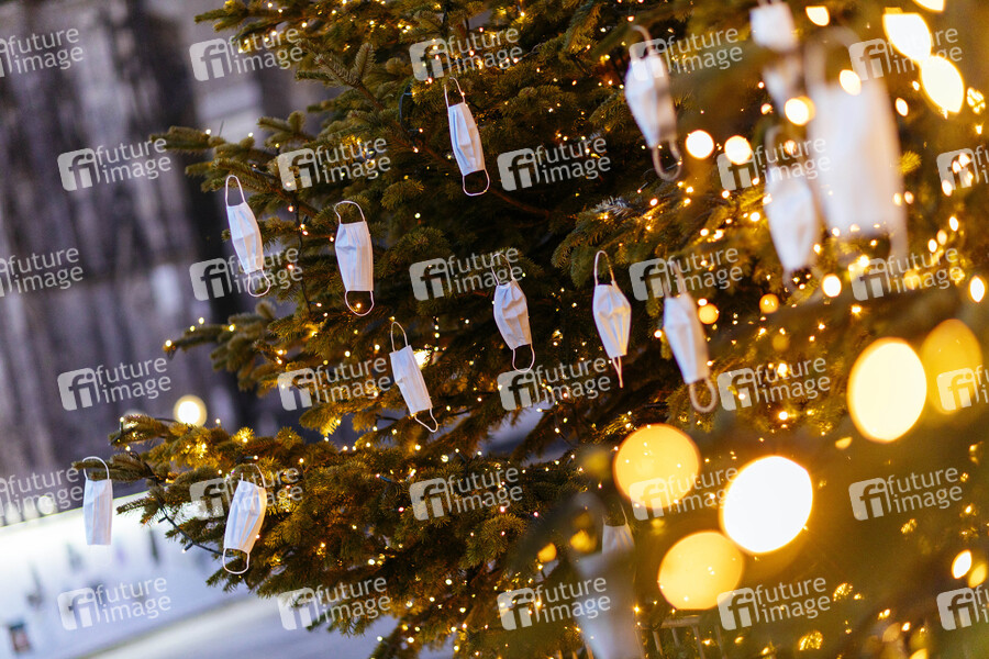 Gesichtsmasken hängen an den Weihnachtsbäumen auf dem Roncalliplatz. Normalerweise wird der Platz als Standort für einen der umsatzstärksten Weihnachtsmärkte der Region genutzt. Aufgrund der Corona-Pandemie wurde dieser ersatzlos gestrichen. (Themenbild, Symbolbild) Köln, 11.12.2020