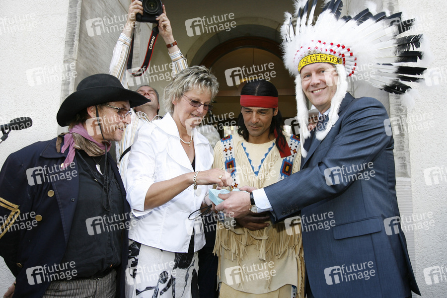 Das Ensemble der Karl-May-Spiele 2009 nimmt Ministerpräsident Wulff in den Kreis der Ehrenhäuptlinge auf. Dazu fanden sich die Mitwirkenden von 'Der Schatz im Silbersee' in der Niedersächsischen Staatskanzlei in Hannover ein.