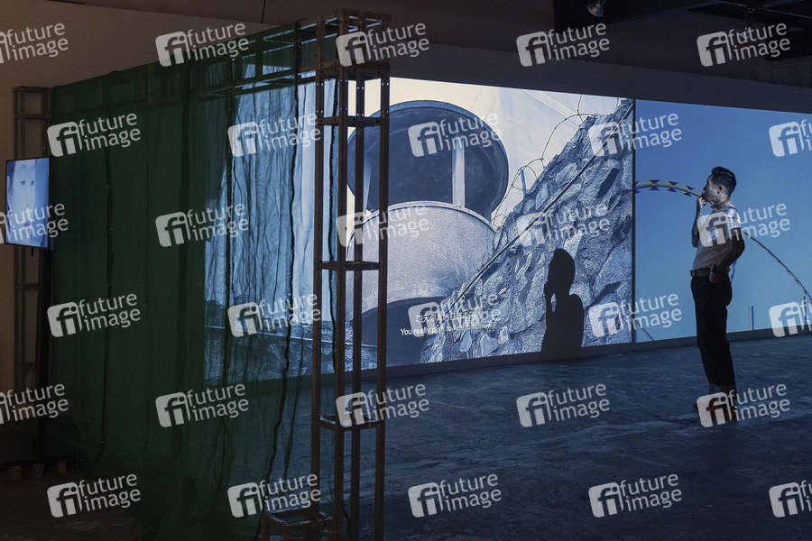 Lee Kai Chung in seiner Ausstellung. Er betreibt künstlerische Forschung zu historischen Ereignissen, politischen Systemen und Ideologien. Macau, 23.02.2024