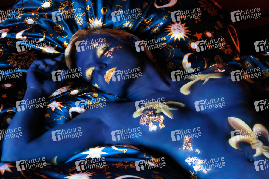 Duesterwald, Bodypainting, Erotik, Frau, Mädchen, nackt, drinnen, weiblich, Körperkunst, Kunst, Malerei, Bett, Schlafzimmer, erotic, woman, girl, nude, indoor, female, body art, body painting, fleur de lis, bed, bedroom