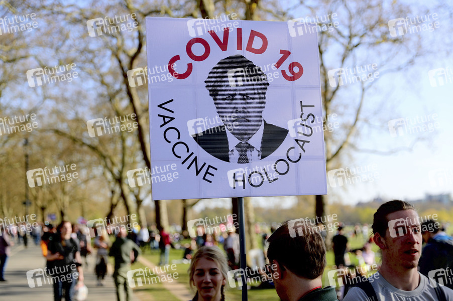 Mehrere tausend Menschen protestieren gegen die Corona-Maßnahmen und ziehen trotz geltender Beschränkungen für Massenversammlungen durch die britische Hauptstadt. Masken trägt dabei so gut wie niemand, dafür aber Protestschilder mit Aufschriften, die sich unter anderem gegen Corona-Pässe und -Tests richteten. London, 24.04.2021