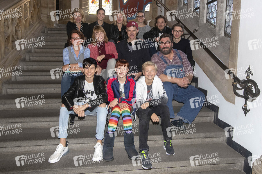 Hintere Reihe: Die Produzentinnen Alexandra Kordes (Kordes & Kordes Film), Cosima von Spreti (TMG), Meike Kordes (Kordes & Kordes Film), Laura Clever (Clever Productions) sowie VFX-Verantwortlicher Christian Sommer (Trixter). Mittlere Reihe: Margit Auer (Buchautorin), Viola M.J. Schmidt (Drehbuchautorin), Gregor Schnitzler (Regisseur), Heiko Pinkowski ('Wondraschek'), Lars Nitschke (FFF Bayern, Film Commission Bayern). Vordere Reihe: Loris Sichrovsky ('Jo'), Emilia Maier ('Ida'), Leonard Conrads ('Benni”) beim Fototermin am Set des Kinofilms 'Die Schule der magischen Tiere' im Neuen Rathaus am Marienplatz. München, 11.10.2019