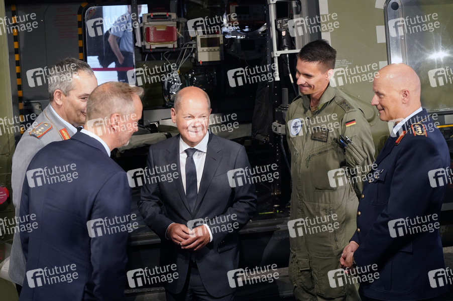 Michael Schöllhorn, Alfons Mais, Olaf Scholz, Maximilian Walter und Ingo Gerhartz bei der ILA-Eröffnung mit anschließendem Rundgang auf dem ILA-Gelände am Flughafen BER Berlin-Brandenburg. Berlin, 22.06.2022
