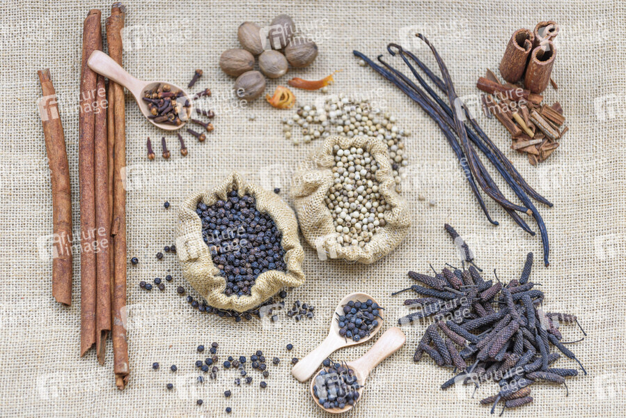 Gewürze, Gewürz, Kochen, Küche, Muskat, Muskatblüte, Zimt, Zimtkassie, Vanille, Nelken, Nelke, schwarzer Pfeffer, weißer Pfeffer, Kubeben Pfeffer, langer Pfeffer, Pfefferkörner, Piper Nigrum, Küche, Aroma, Aromatisch, Gastronomie, Indonesien, Organic, Spices, Sulawesi, Symbolbild, Symbolfoto