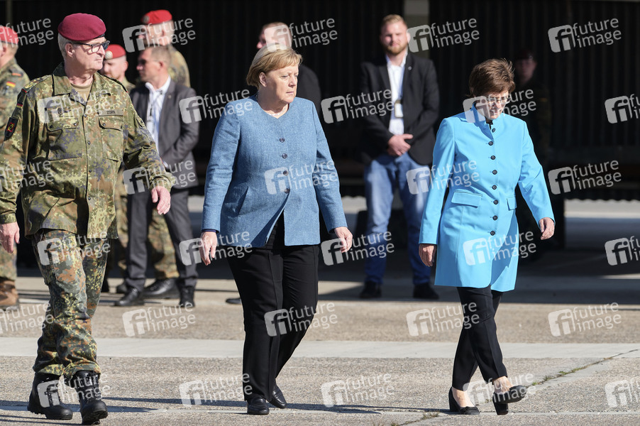 General Eberhard Zorn, Bundeskanzlerin Angela Merkel und Verteidigungsministerin Annegret Kramp-Karrenbauer bei einem Appell für die Soldatinnen und Soldaten der Evakuierungsmission in Kabul und dem Feierlichen Gelöbnis von Rekruten des Fallschirmjägerregiments 31 in der Fallschirmjägerkaserne Seedorf. Seedorf, 22.09.2021