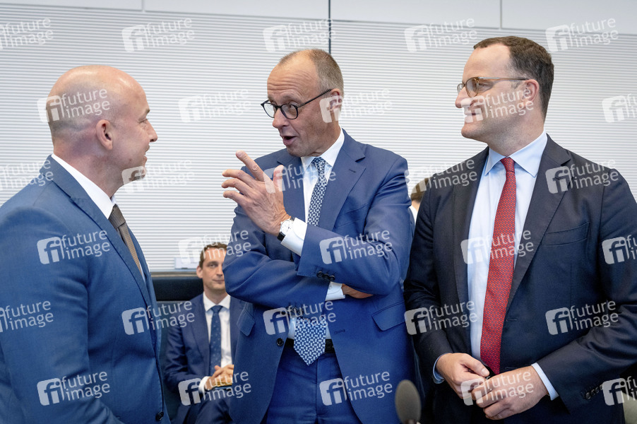 Alexander Hoffmann, Friedrich Merz und Jens Spahn bei der Fraktionssitzung der CDU/CSU-Bundestagsfraktion im Reichstagsgebäude. Berlin, 22.09.2025