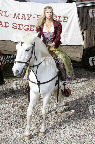 Schauspielerin, Prominenz, Fototermin, Pressetermin, Photocall, Fotocall, Unterhaltung, Entertainment, Kultur, Western, Freilichtbühne, Freilichttheater, Freilufttheater, Kalkbergstadion, Open Air Theater, 68. Karl-May-Spiele 2019, Unter Geiern - Der Sohn des Bärenjägers, Tier, Pferd