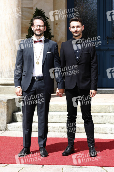 Andreas Zippel mit Partner Luca Maaß bei der Eröffnung der 112. Richard-Wagner-Festspiele 2024 mit der Neuinszenierung von 'Tristan und Isolde' im Bayreuther Festspielhaus. Bayreuth, 25.07.2024