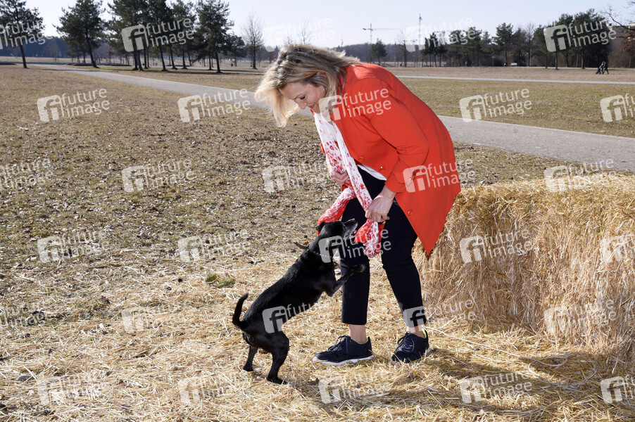 Karin Engelhard mit Hund Louis beim Spaziergang im Riemer Park. München, 28.02.2021