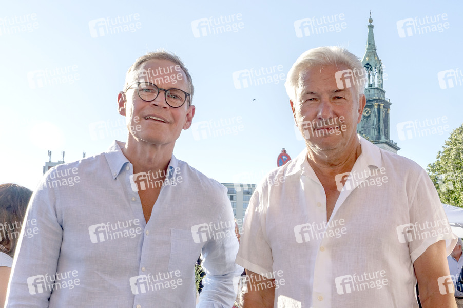 Michael Müller und Klaus Wowereit beim 23. Berliner Hoffest 2025 am Roten Rathaus. Berlin, 01.07.2025