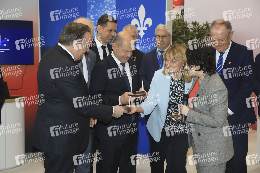 Deutsche Messe AG, Hannover Messe Industrie, Weltleitmesse der Industrie, Industriemesse, Industrieschau, Automatisierung, IT-Sicherheit, KI, Technologie, Wirtschaft, Ausstellung, Fair, Messe, Eröffnung, Opening, Leitmesse, Synergie und Kooperation, Wasserstoff & Brennstoffzellen, CO2-neutrale Produktion, Energizing a Sustainable Industry, Künstliche Intelligenz, Partnerland Kanada, Politiker, Bundeskanzler, Ministerpräsident von Niedersachsen, Premierminister von Quebec