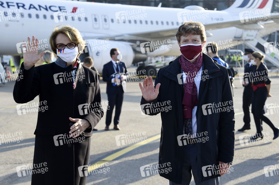 Botschafterin Anne-Marie Descotes und Flughafenchef Engelbert Lütke Daldrup beim letzten Abflug. Mit der Inbetriebnahme des Flughafens Berlin Brandenburg Willy Brandt (BER) wird der gesamte Luftverkehr der Hauptstadtregion an einem Standort konzentriert. Der Flughafen Tegel, kurz TXL, schließt am 8. November. 60 Jahre nach dem ersten Linienflug von Air France wird am 8. November ein Flugzeug der französischen Airline zum allerletzten Mal von dem Flughafen im Nordosten Berlins starten und Adieu sagen. Berlin, 08.11.2020