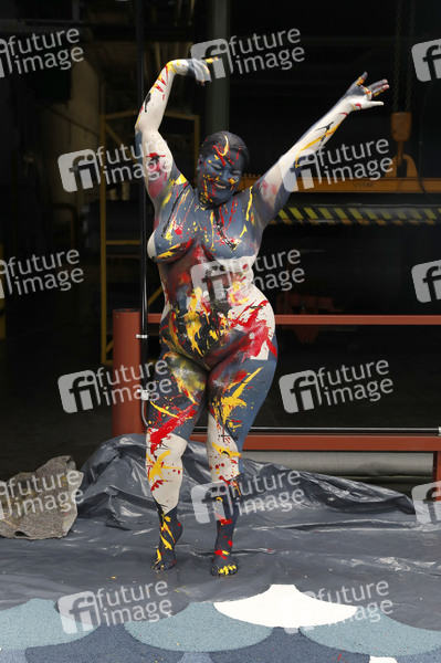 Bodyart-Künstler Jörg Düsterwald realisiert zum Thema 'Vielfältigkeit' mit verschiedenen Fotomodell-Typen eine Kunstwerk-Serie. In den Produktionshallen des kooperierenden Unternehmens Vorwerk flooring in Hameln hat er das Plus-Size-Model Nisi passend zum gesponserten Bodenbelag mit einem Bodypainting versehen und anschließend flüssige Farbspuren aufgetragen.