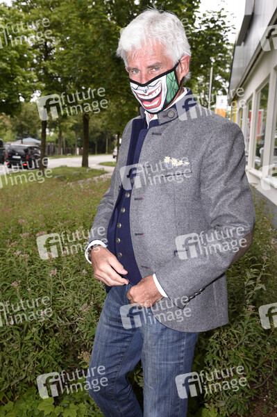 Frederic Meisner mit seiner eigenen Joker-Maske nach der Präsentation des ersten Flavura Maskomaten in München vor der Netto-Filiale in Aubing. München, 17.06.2020
