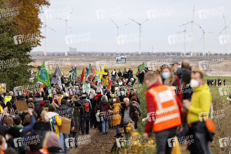 Kohlegegner wie Mitglieder von Greenpeace, Fridays for Future und linksradikalen Gruppen wie der Antifa haben in Lützerath gegen den Tagebau protestiert. Das kleine Dorf an der Kante von Garzweiler soll dem Braunkohleabbau weichen. Allerdings will der Energiekonzern RWE vorerst auf den Abriss verzichten. Im Bild Teilnehmer der Demo gegen den Abriss. Lützerath, 31.10.2021