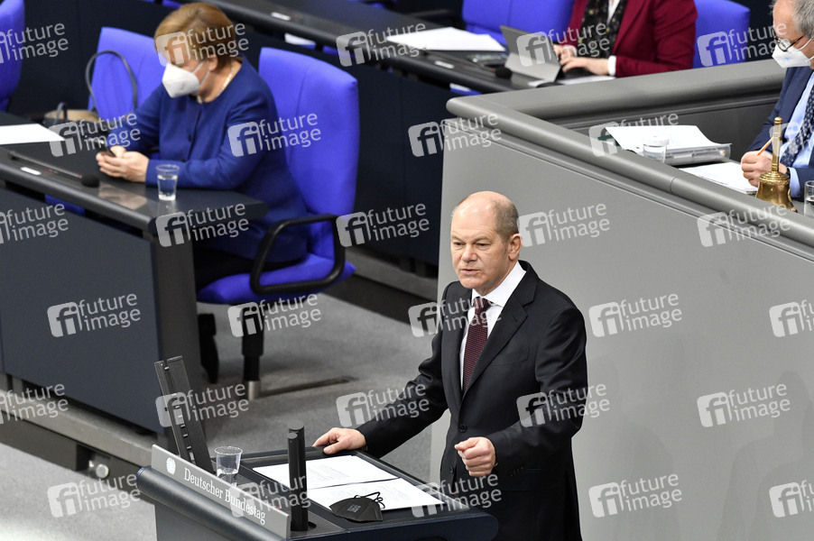 Angela Merkel und Olaf Scholz in der 212. Sitzung des Deutschen Bundestages im Reichstagsgebäude. Berlin, 25.02.2021