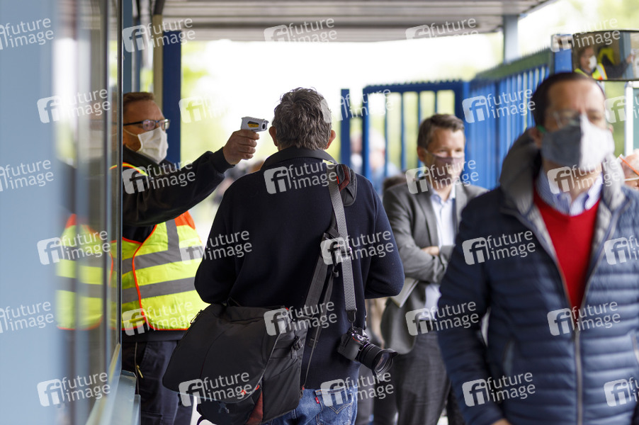 Temperaturkontrollen der Mitarbeiter und Besucher beim Besuch von Armin Laschet im Ford-Werk anlässlich der Wiederaufnahme der Produktion nach den Corona-Einschränkungen. Köln, 04.05.2020