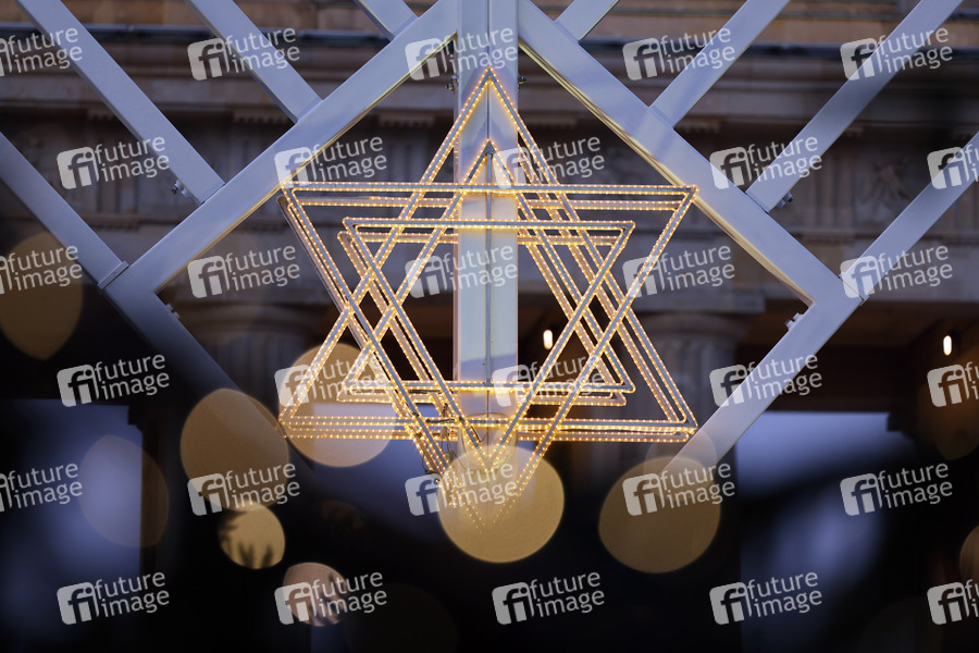 Der beleuchtete Davidstern am Chanukka-Leuchter anlässlich der beginnenden Chanukka-Feiertage am Brandenburger Tor. (Themenbild, Symbolbild) Berlin, 07.12.2021