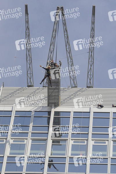 Playboy Playmate Base Flying vom Dach des Park Inn Hotels am Alexanderplatz, Berlin