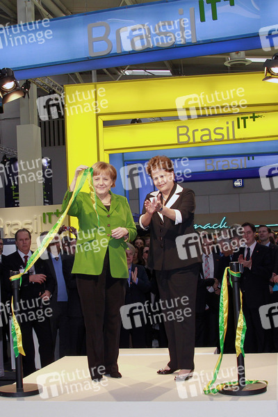 Eröffnungsrundgang von Bundeskanzlerin Merkel auf der CeBIT 2012 (Centrum der Büro- und Informationstechnik), der weltgrößten Messe für Informations- und Computertechnik auf dem Messegelände, Hannover - Am Messestand von Brasilien