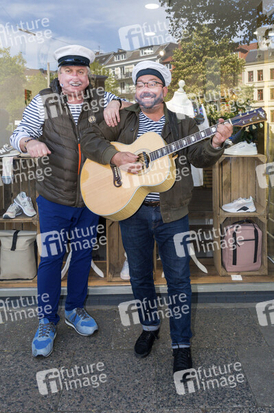 Klaus Baumgart und Claas Vogt von Klaus & Klaus beim Fototermin vor der Textildruckerei EINDRUCK, welche Mund-Nase-Masken mit dem echten Lächeln der Träger herstellt. Hamburg, 06.05.2020