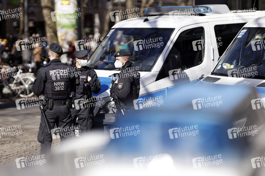 Polizisten am Rande der Kundgebung. Am Freitag finden mehrere Demonstrationen zum globalen Klimastreik unter dem Motto 'Klimagerechtigkeit' von Fridays for Future und weiteren Gruppierungen statt. Köln, 19.03.2021