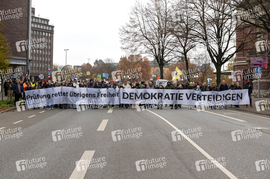 Demonstranten bei der PRÜF! - Auftakt-Demo zum Start einer Kampagne des Satirikers Nico Semsrott für die Prüfung aller als rechtsextrem eingestuften Parteien. Hamburg, 08.11.2025