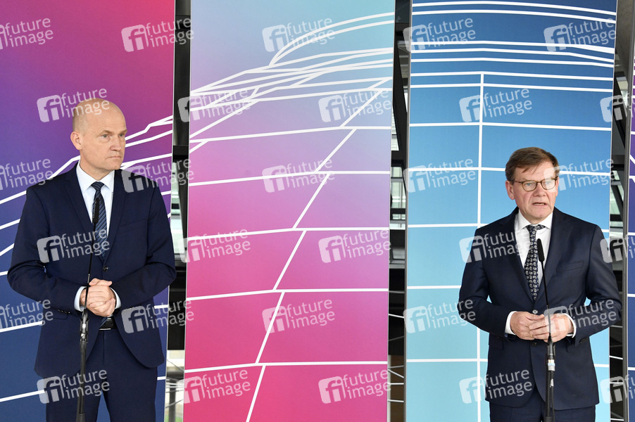 Ralph Brinkhaus und Johann Wadephul bei einem Pressestatement der CDU/CSU-Bundestagsfraktion vor der Fraktionssitzung auf der Fraktionsebene im Reichstagsgebäude. Berlin, 18.05.2021