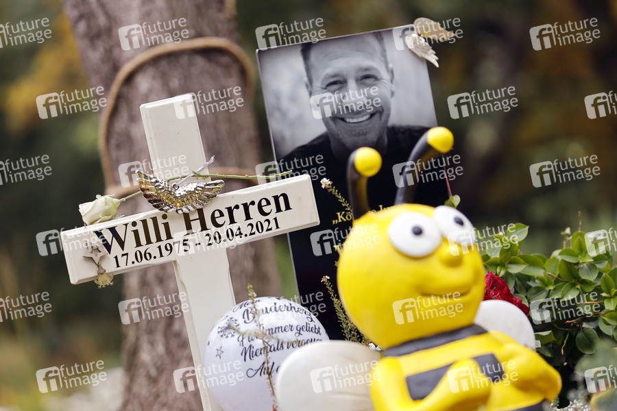 Das gepflegte Grab von Willi Herren auf dem Melaten Friedhof in Köln. Unter den Hinterbliebenen ist ein Streit über die Pflege des Grabs entstanden: Witwe Jasmin Herren äußerte Kritik, die Familie des Schlagersängers würde sich nicht gut genug um das Grab kümmern. Herrens Schwester Annemie Herren dementierte die Vorwürfe. Köln, 22.10.2021