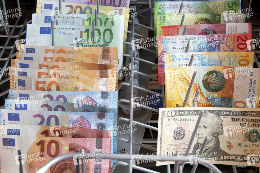 EURO, Schweizer Franken und Dollar Banknoten in einer Geschirrspülmaschine