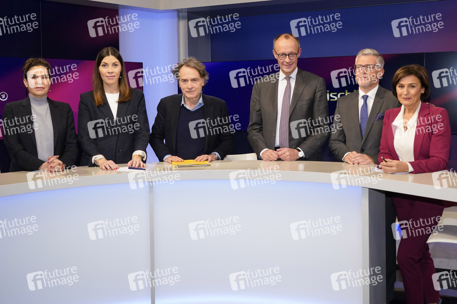 Laura Kipfelsberger, Dagmar Rosenfeld, Giovanni di Lorenzo, Friedrich Merz, Andrij Melnyk und Sandra Maischberger in der ARD-Talkshow 'maischberger' im Studio Berlin Adlershof. Berlin, 04.12.2024
